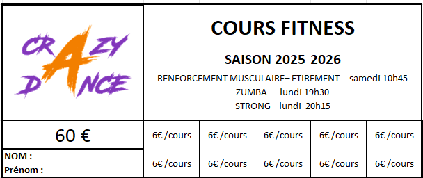 Carte à demander par mail : crazy.dance.27@orange.fr